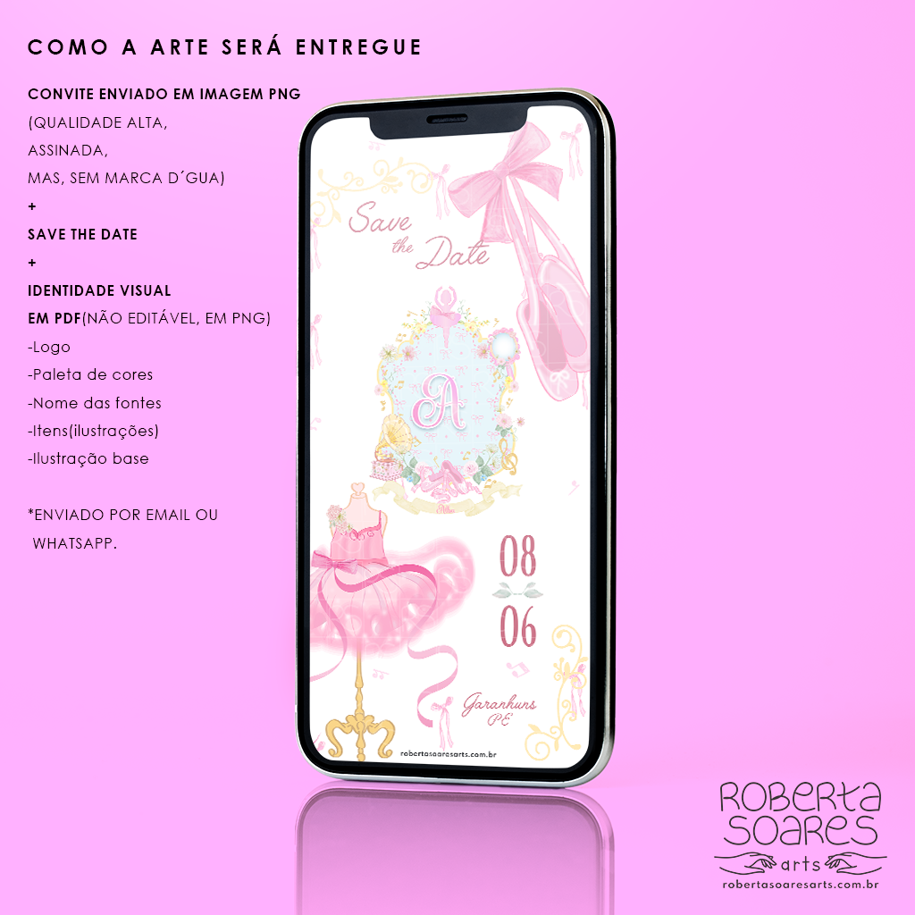 O cliente escolhe o tema, sem alterações no layout escolhido, serão adicionados, as informações do evento, e o nome do aniversariante/casal na logo/monograma, e escolhe o personagem que mais se encaixa no perfil do aniversariante no layout já existente. Após a confirmação do pagamento e envio das informações o convite será enviado em até 2 dias úteis. Os arquivos serão enviados via link para o Whatsapp da cliente.