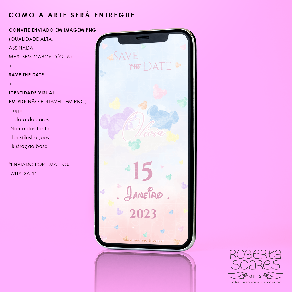 O cliente escolhe o tema, sem alterações no layout escolhido, serão adicionados, as informações do evento, e o nome do aniversariante/casal na logo/monograma do layout já existente. Após a confirmação do pagamento e envio das informações o convite será enviado em até 2 dias úteis. Os arquivos serão enviados via link para o Whatsapp da cliente.