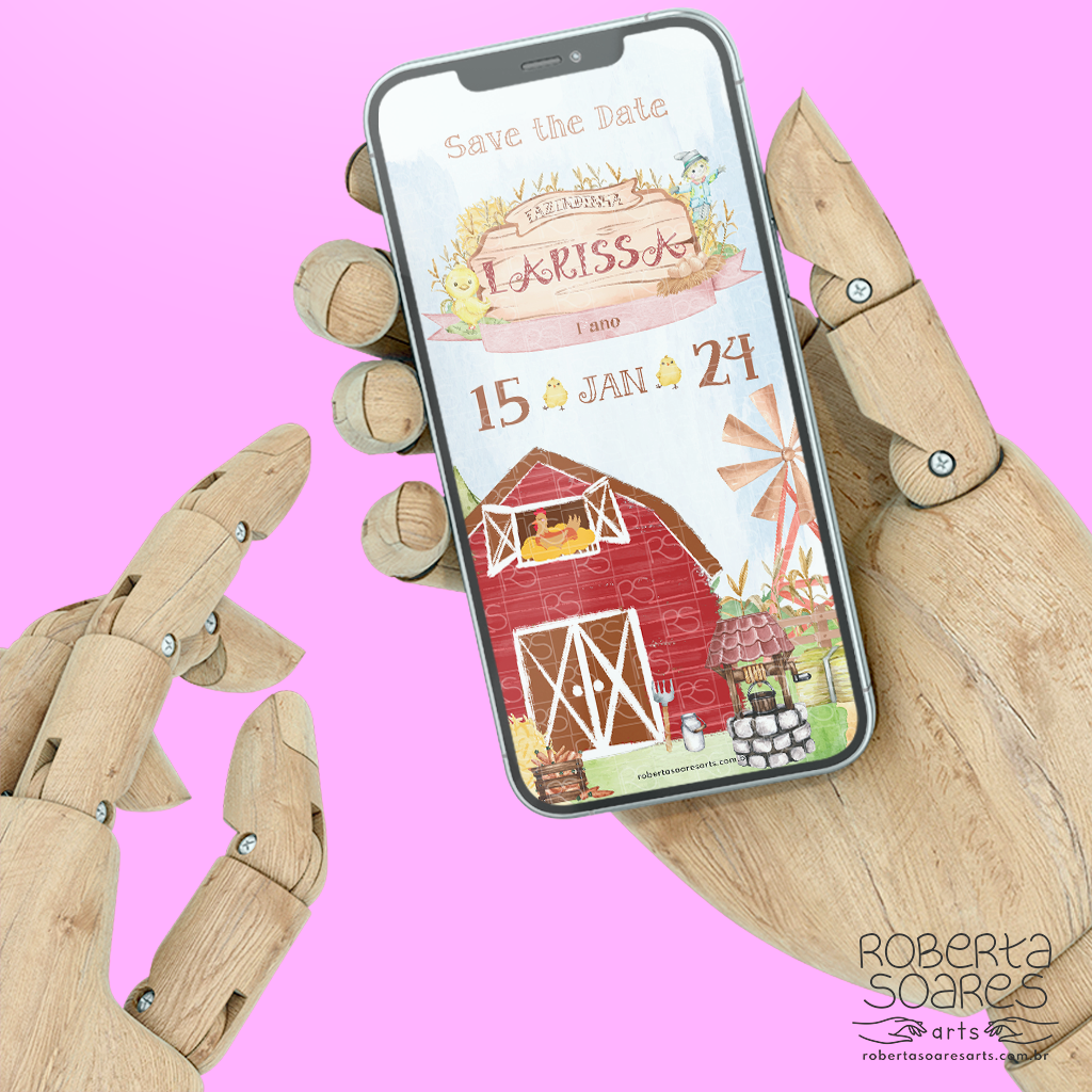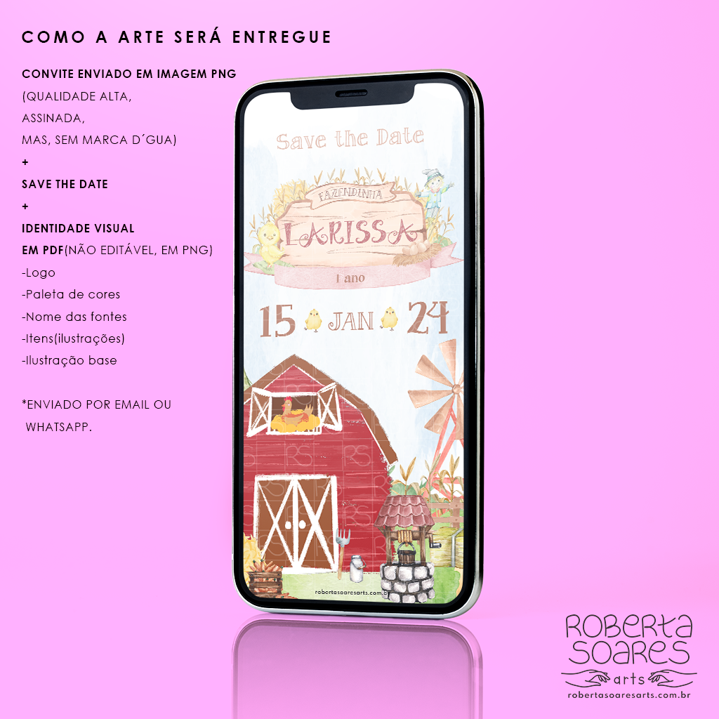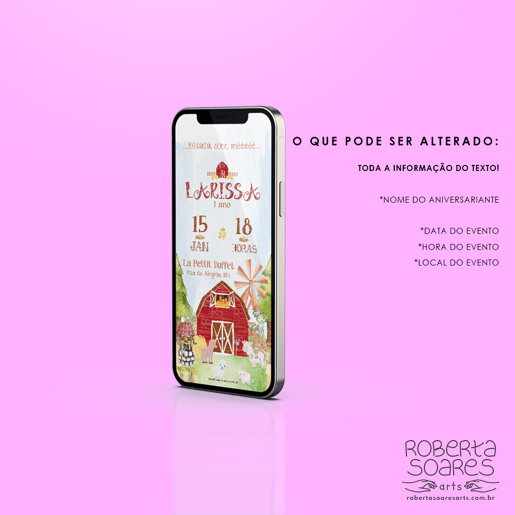 O cliente escolhe o tema, sem alterações no layout escolhido, serão adicionados, as informações do evento, e o nome do aniversariante/casal na logo/monograma do layout já existente. Após a confirmação do pagamento e envio das informações o convite será enviado em até 2 dias úteis. Os arquivos serão enviados via link para o Whatsapp da cliente.