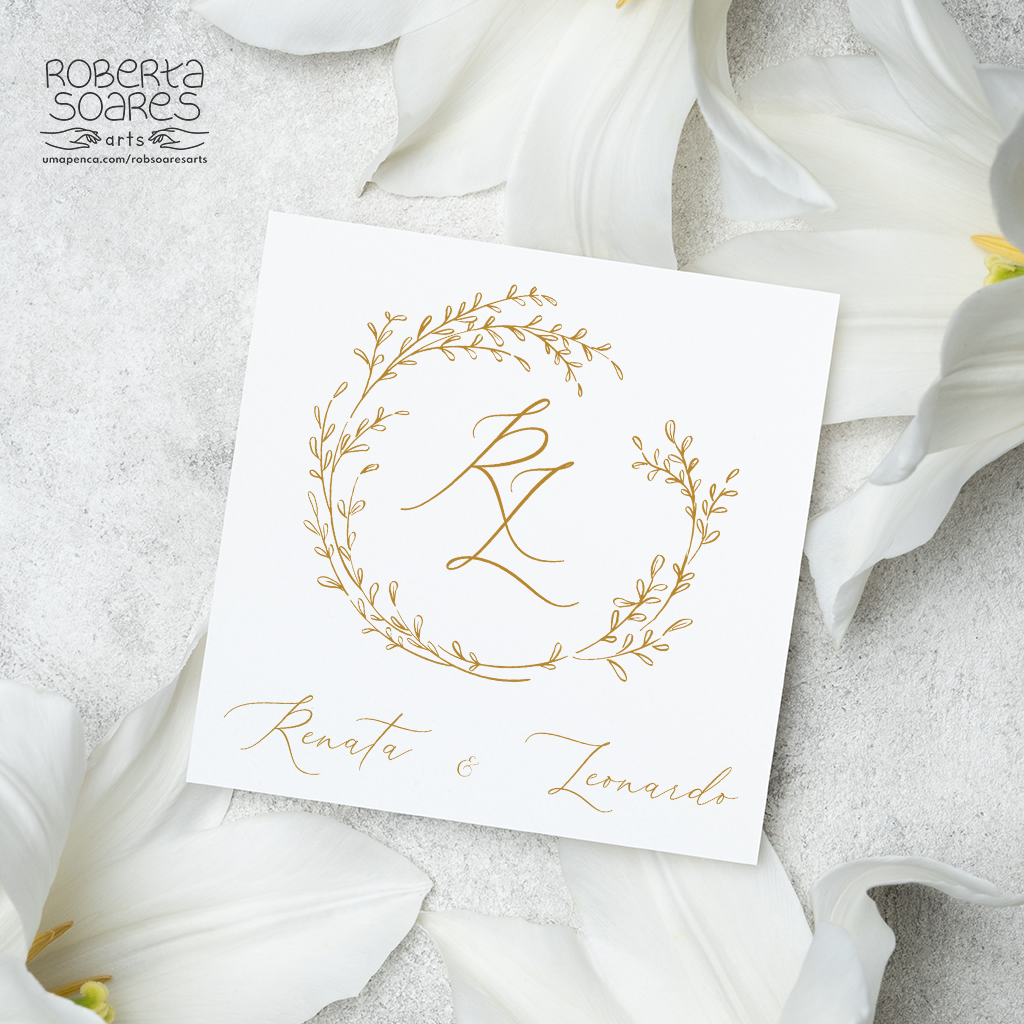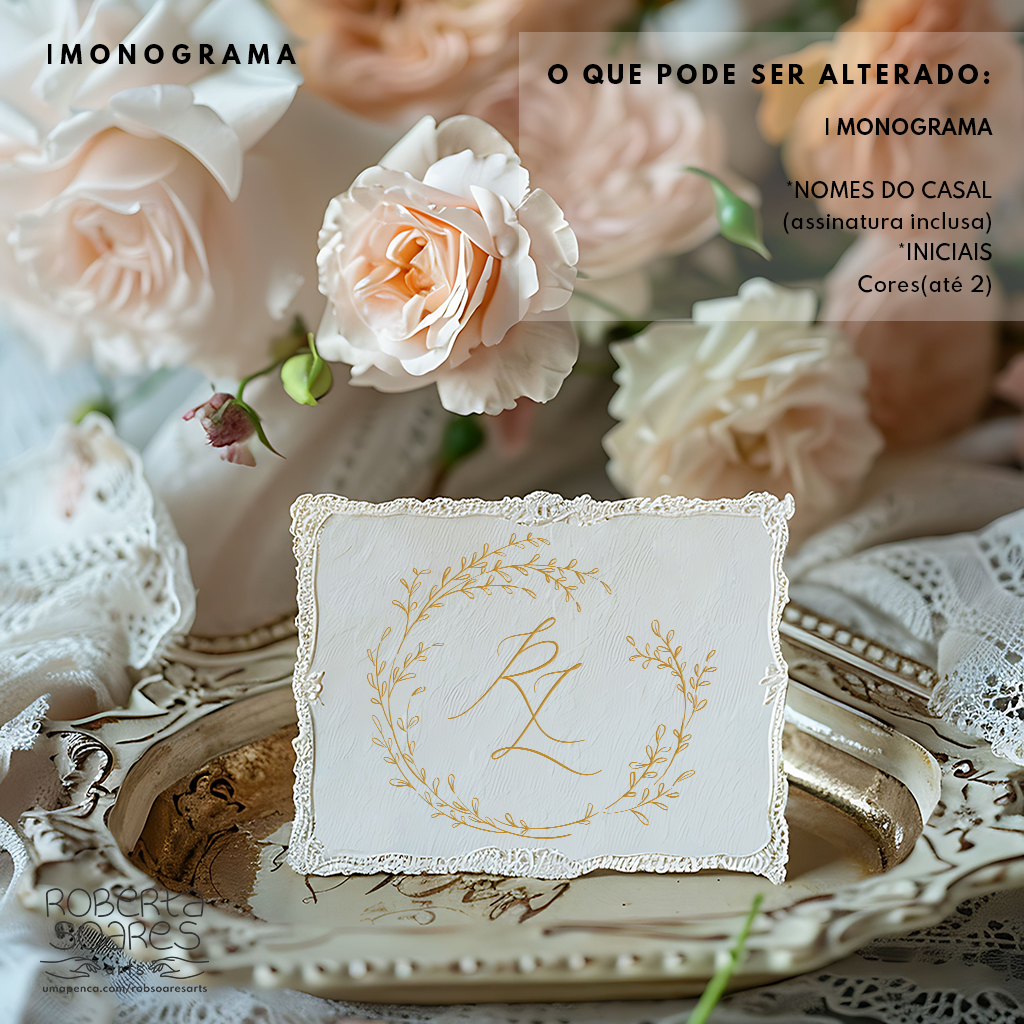 O cliente escolhe o monograma, sem alterações no layout escolhido, serão substituidas as iniciais, o nome dos noivos(assinatura) e as cores . Após a confirmação do pagamento e envio das informações o monograma será enviado em até 2 dias úteis. Os arquivos serão enviados via link para o Whatsapp da cliente.