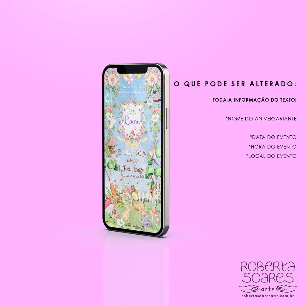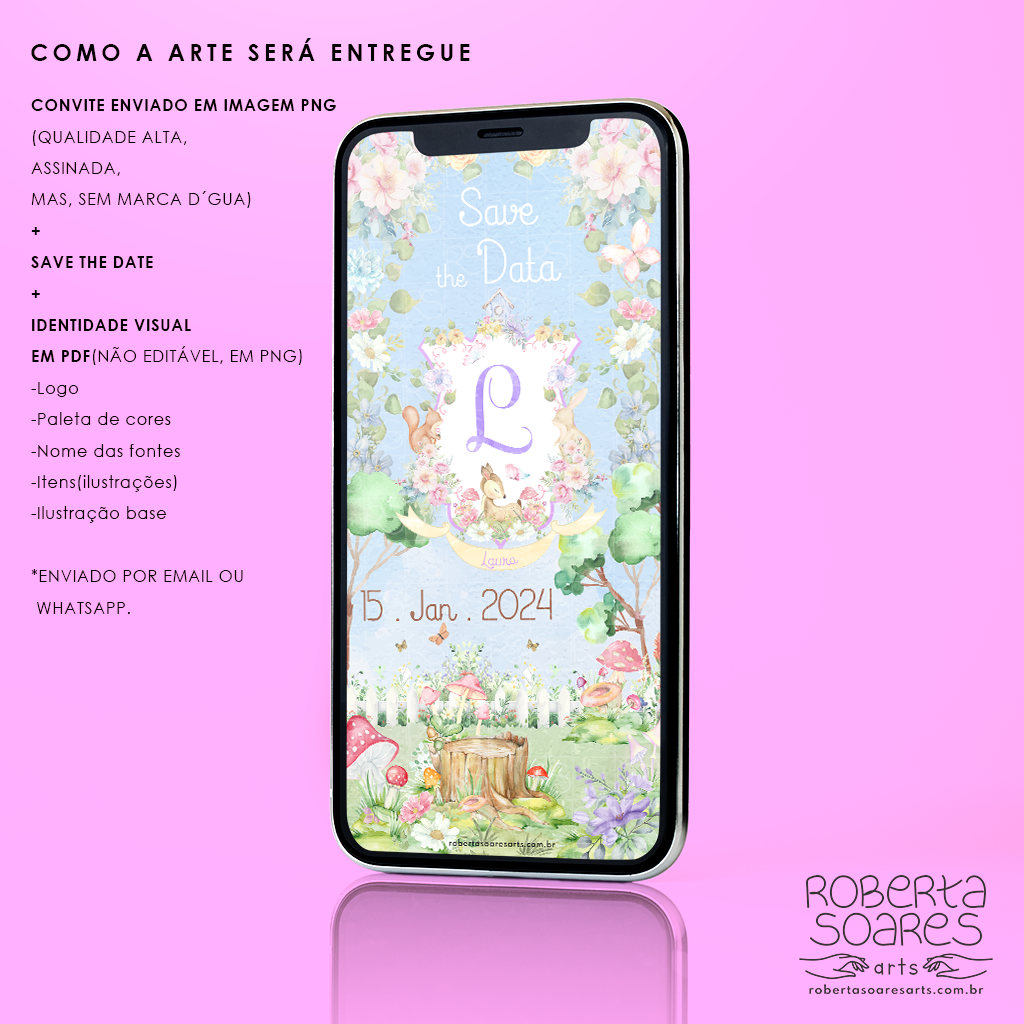 O cliente escolhe o tema, sem alterações no layout escolhido, serão adicionados, as informações do evento, e o nome do aniversariante/casal na logo/monograma do layout já existente. Após a confirmação do pagamento e envio das informações o convite será enviado em até 2 dias úteis. Os arquivos serão enviados via link para o Whatsapp da cliente.