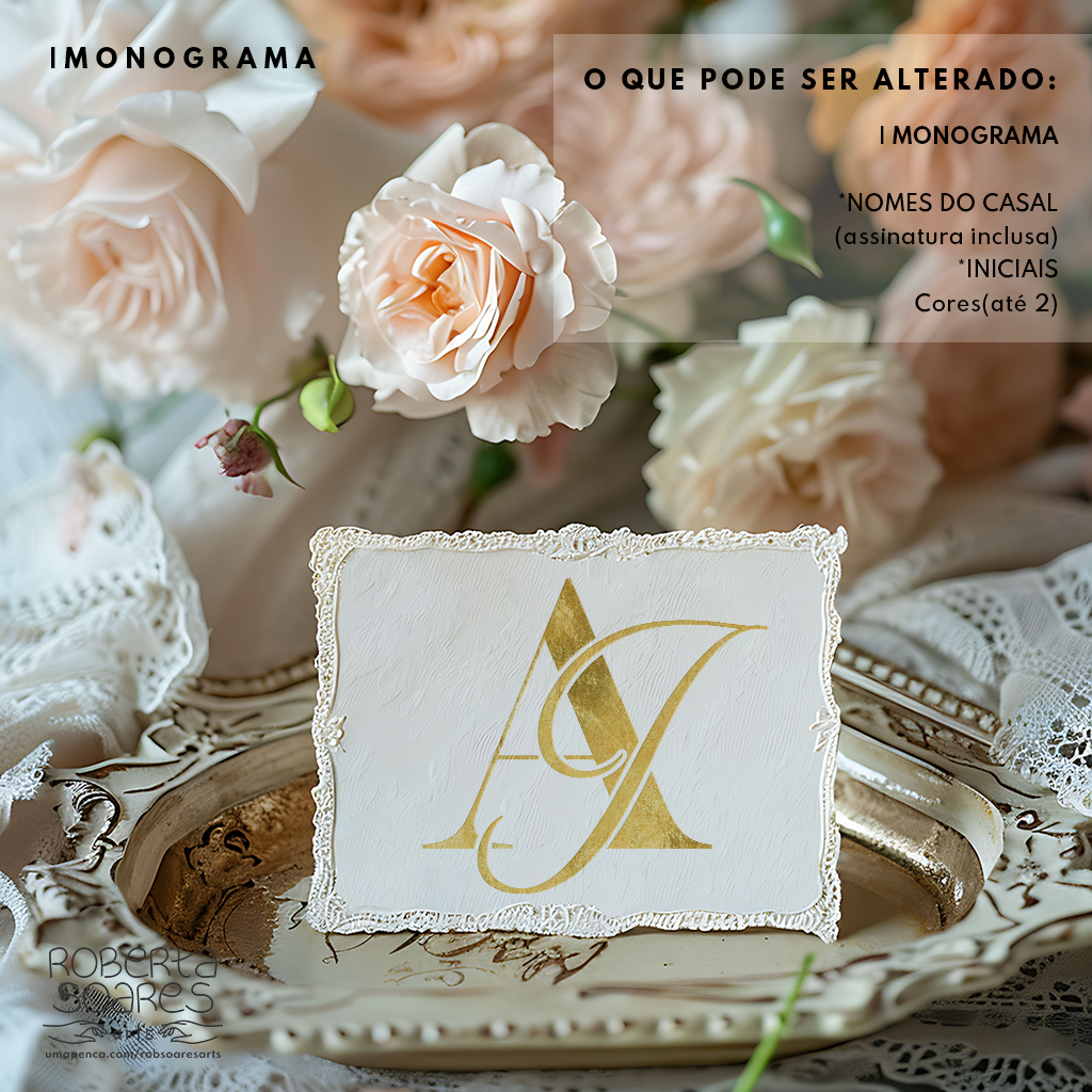 O cliente escolhe o monograma, sem alterações no layout escolhido, serão substituidas as iniciais, o nome dos noivos(assinatura) e as cores . Após a confirmação do pagamento e envio das informações o monograma será enviado em até 2 dias úteis. Os arquivos serão enviados via link para o Whatsapp da cliente.