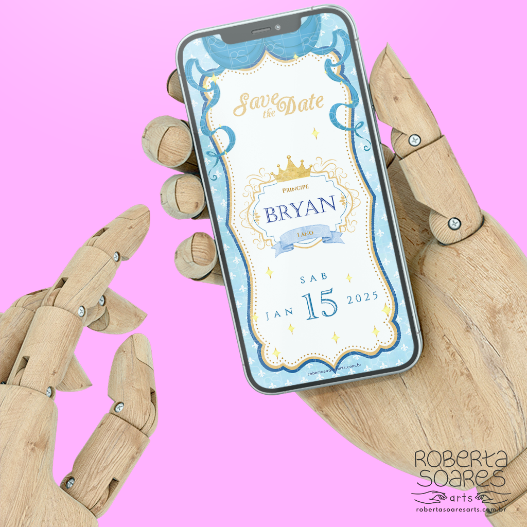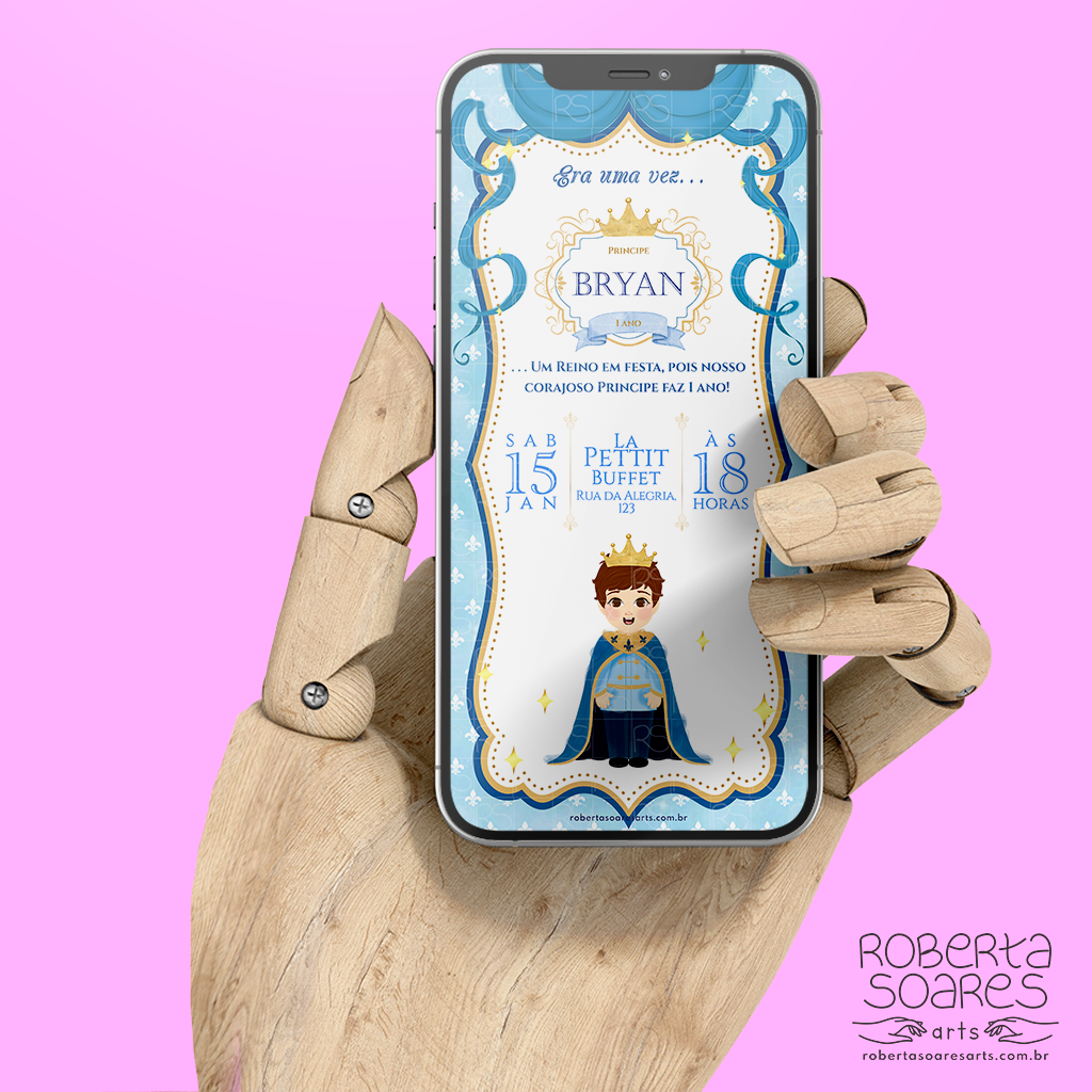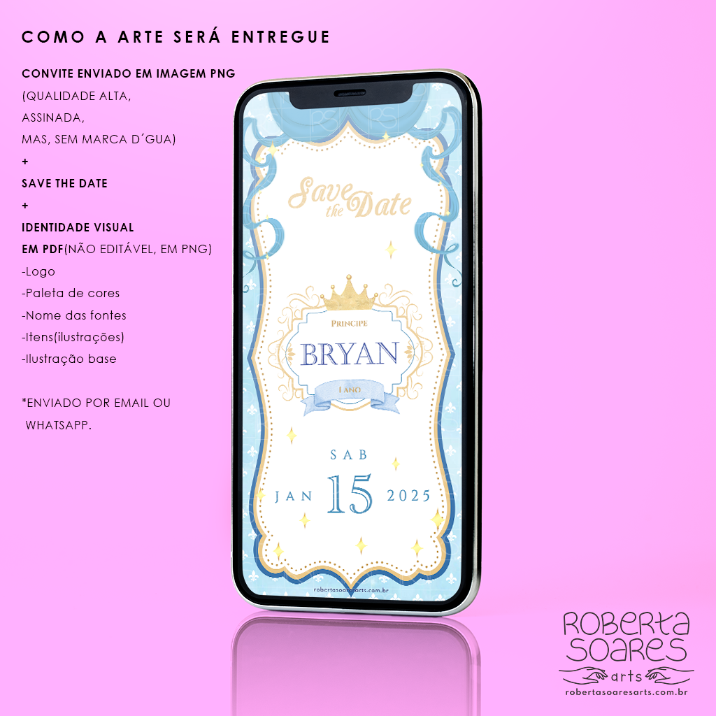 O cliente escolhe o tema, sem alterações no layout escolhido, serão adicionados, as informações do evento, e o nome do aniversariante/casal na logo/monograma, e escolhe o personagem que mais se encaixa no perfil do aniversariante no layout já existente. Após a confirmação do pagamento e envio das informações o convite será enviado em até 2 dias úteis. Os arquivos serão enviados via link para o Whatsapp da cliente.
